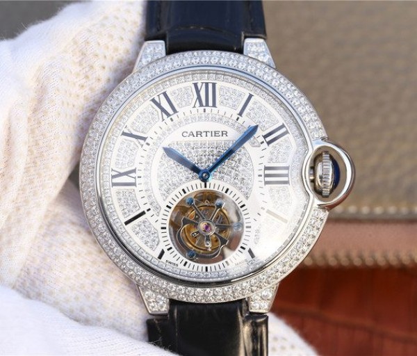 Swiss Made Cartier Ballon Bleu de Cartier Tourbillon SS Full paved Diamonds Leather Strap