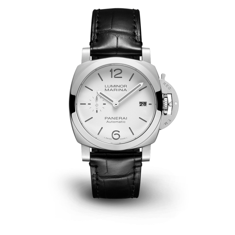 White with luminous Arabic numerals and hour markers. Date at 3 o'clock and small seconds at 9 o'clock